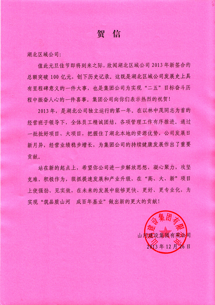 集团公司特向湖北区域公司发来贺信表示祝贺,并期待湖北区域公司为实现“筑品质米兰官方端网站 成百年基业”的企业愿景做出新的更大的贡献!