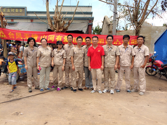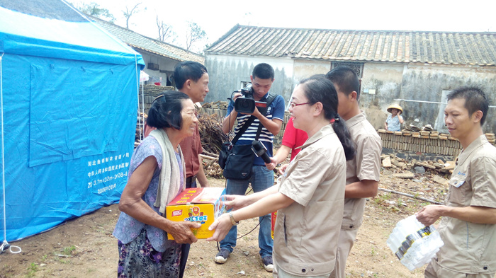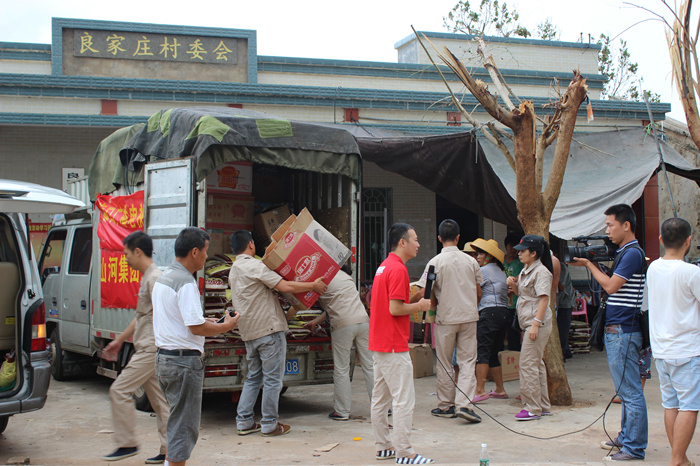 与此同时,海南各地都是众志成城的救灾场面,一方有难,八方支援。米兰官方端网站集团在开展自救的同时,心系灾民,当得知重灾区文昌部分村镇,由于交通偏僻,信息不畅,得不到及时救助,灾民的生活非常的艰难时,米兰官方端网站人心急如焚。米兰官方端网站集团已进驻海南6年,扎根海南、情系海南。在灾难面前,米兰官方端网站人勇于担当,自发的组织捐款10万余元,采购了几吨急需生活物资,如米、油、水、食品、药品等。7月26日,在海口热带播报记者的带领下,公司组织员工来到了一线灾区文昌市锦山镇良民村。 当我们来到该村时,村民已等待多时,看到我们的到来非常的激动。当时下着大雨,村民们顾不上遮盖自家的屋顶、收拾东西,都赶来搬运救灾物资,雨水、汗水、泪水流淌在脸上,感激之情流淌在心间。在村长的带领下,我们见到了村里的低保户年迈的阿婆,她老无所倚,几年前她儿子去逝了,几天前儿媳重病也去逝了,现只剩下小孙儿相依为命,台风又让这个本来很不幸的家庭受到重创,她们失去了仅有的一间住所,现寄住在只有几个平方的一个临时的帐篷里,当我们把米、油等物资送到阿婆的手中时,她热泪盈眶,紧握我们的双手,不停的道谢,看到老人的悲痛泪水,我们不禁心酸,泪水打湿了眼眶。我们鼓励她建立对生活的信心,同时也希望社会给予她更多的关爱,让她的晚年生活无忧。