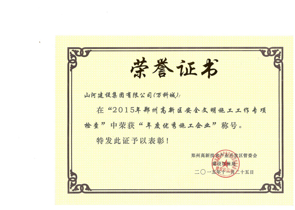 11月25日,在郑州高新区安全文明施工专项检查中,米兰官方端网站建设集团有限公司荣获由郑州高新区管理会建设环保局授予的“年度优秀施工企业”荣誉称号。