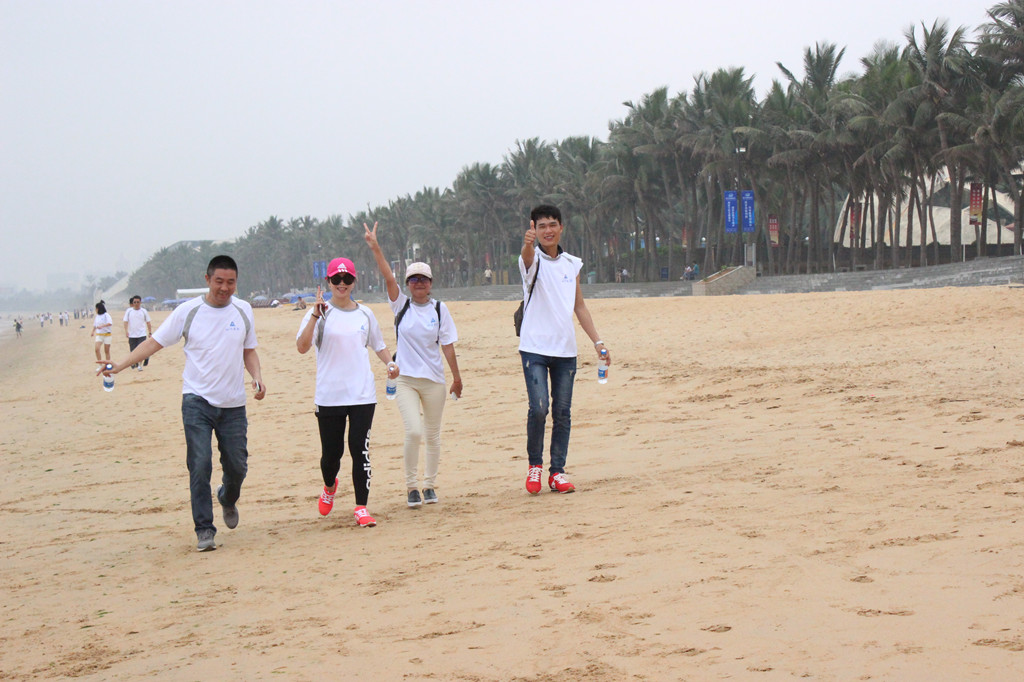 活动当天,碧海蓝天微风轻拂,参加徒步的员工一早便来到集合地点,海南公司活动线路设置在海口西秀海滩至贵族游艇会,全程路段以沙滩为主。海南公司、海口恒正实业公司及各项目部代表共计50人参加了徒步行的活动,比赛共分为15组,每个小组三人,其中有一名队员必须是异性。为体现米兰官方端网站大家庭的氛围,公司人员全部与项目部人员混编组队。