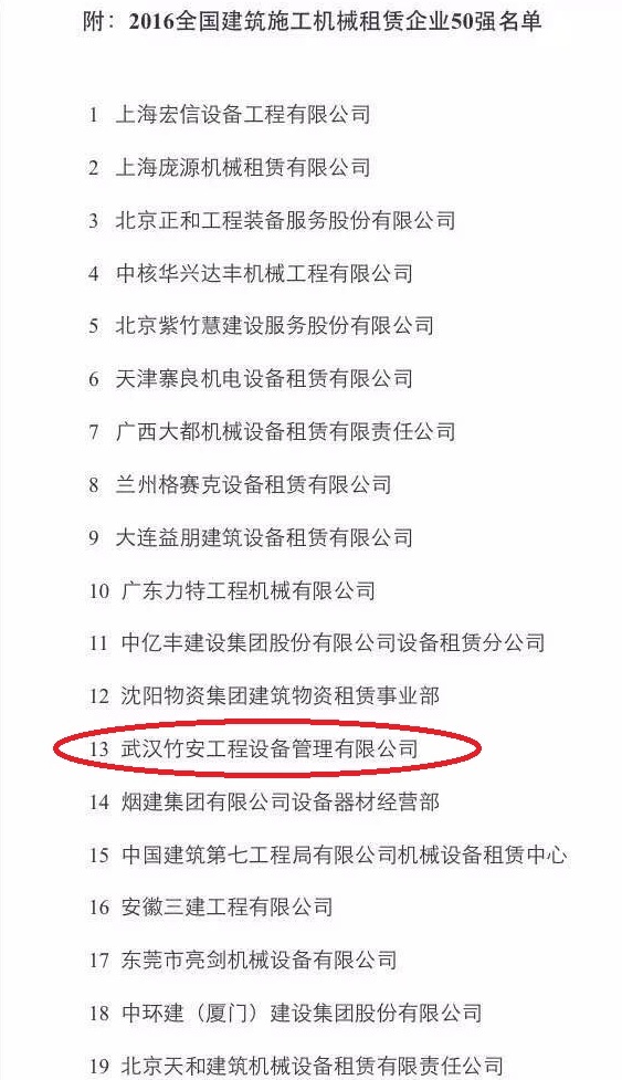 武汉竹安再度荣获“全国建筑施工机械租赁50强企业”