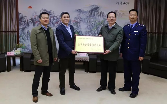 团风县委常委、副县长涂军(右二)向米兰官方端网站集团董事长程理财(左二)授牌