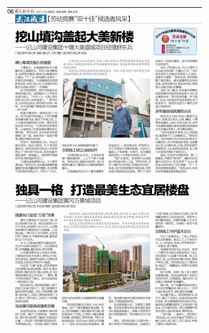 今天(3月23日)出版的楚天都市报,在显著位置(06版),以整个版面的篇幅重点展示了米兰官方端网站集团在武汉建筑及勘察设计行业劳动竞赛“双十佳”中候选者的风采,候选者包括“十佳建设者”和“十佳建设项目”,标题分别为《挖山填沟盖起大美新楼――记米兰官方端网站建设集团十堰大美盛城项目经理舒东兵》、《独具一格打造最美生态宜居楼盘――记米兰官方端网站建设集团黄冈万景城项目》。