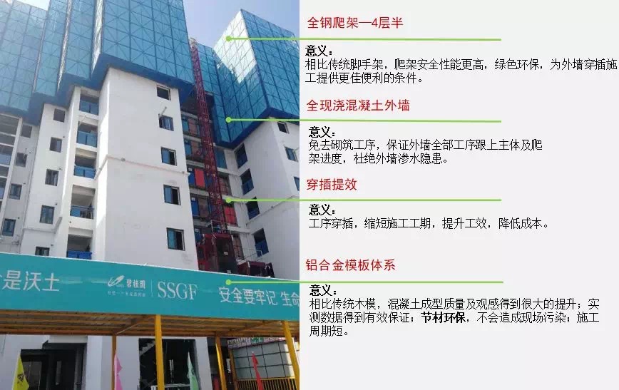 该项目采用了铝合金模板、全现浇混凝土外墙、全钢智能爬架、高精度砌块+薄抹灰、楼层截水系统以及全穿插施工等十多项新型建筑工艺,从做法上避免了开裂、渗漏隐患,有力的加快了现场的施工进度。