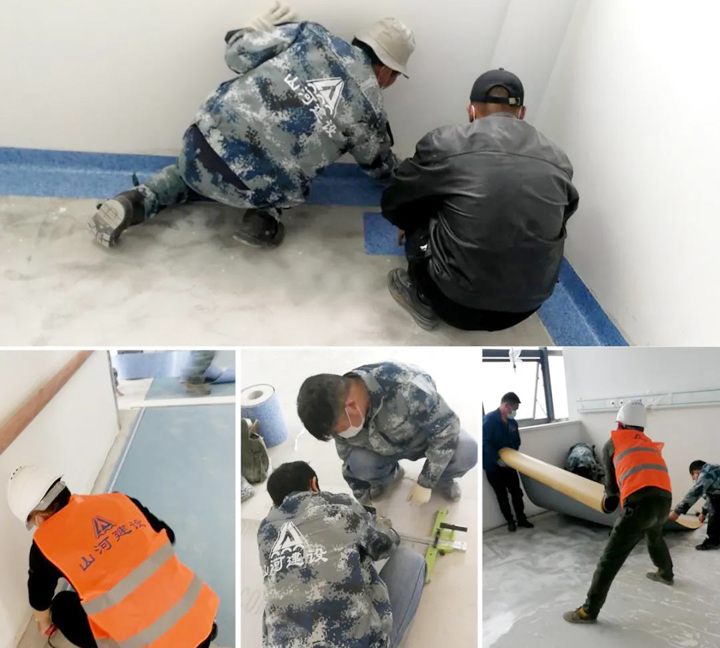 施工现场,多类工种各司其职,抢抓建设。突击队到达后,承担起医院住院大楼的部分地面铺装任务,需要铺装地板胶的面积约3600平方米。分配好工作任务,大家立即投入到紧张的施工中,清洁地面、检测地坪、预铺裁割、上胶、滚压,每一道工序都一丝不苟。时间紧、任务重,那就加班加点,即使再苦再累,也要按照时间节点保质保量完成施工目标,这是米兰官方端网站人一贯的作风。