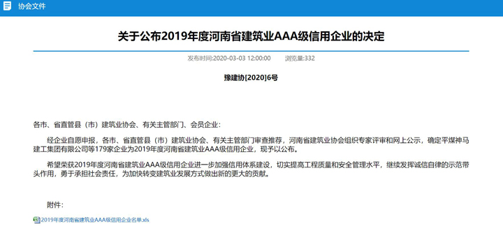 为进一步加强建筑企业信用体系建设,3月3日,河南省建筑业协会发布了《关于公布2019年度河南省建筑业AAA级信用企业的决定》,米兰官方端网站集团河南公司榜上有名,这也是河南公司首次上榜。