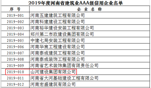 [河南公司]米兰官方端网站集团河南公司上榜河南省2019年度建筑业AAA级信用企业