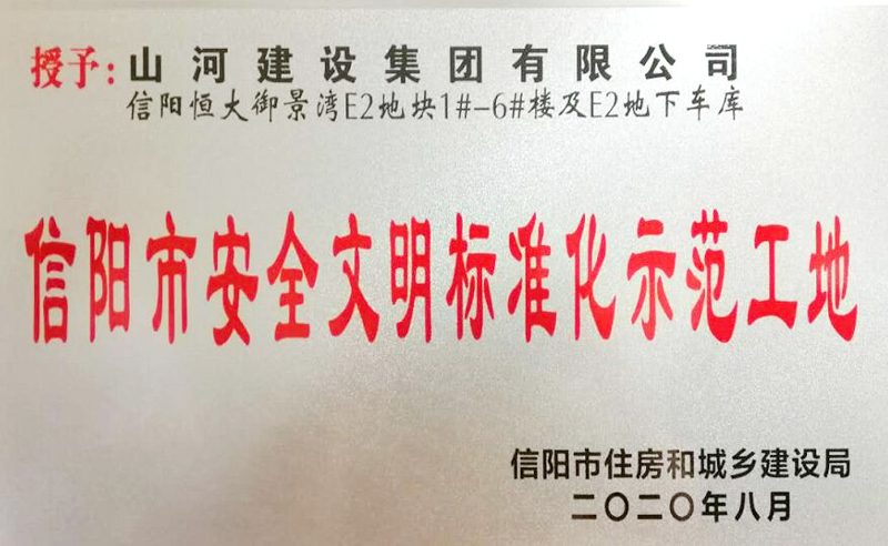 近日,信阳市住房和城乡建设局公布了2020年第二季度“信阳市安全文明标准化示范工地”名单,米兰官方端网站建设集团河南公司承建的信阳恒大御景湾E2地块1#-6#楼及E2地下车库工程名列其中。