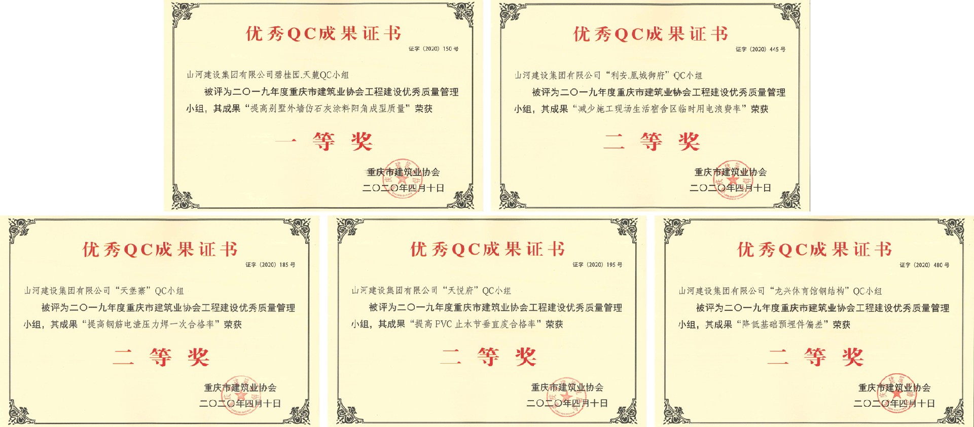 碧桂园·天麓QC小组成果“提高别墅外墙仿石灰涂料阳角成型质量”荣获一等奖,利安·凰城御府QC小组成果“减少施工现场生活宿舍区临时用电浪费率”、天堡寨QC小组成果“提高钢筋电渣压力焊一次合格率”、天悦府QC小组成果“提高PVC止水节垂直度合格率”、龙兴体育馆钢结构QC小组成果“降低基础预埋埋件偏差”荣获二等奖。