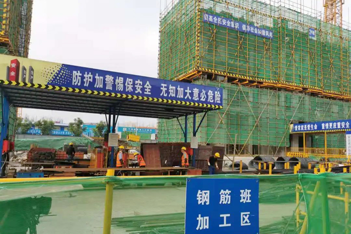 文明施工是施工现场安全生产、节能环保的保障,由于施工场地狭窄,地库分区施工,地库封顶后,在保证安全的前提下,将地库分割并设置栏杆,将施工通道、钢筋加工区、木工加工区、水电安装材料堆放区、周转材料堆放区、泥土布料机及泵管存放区等进行分区,并在各区中央位置设置工人喝茶休息区。