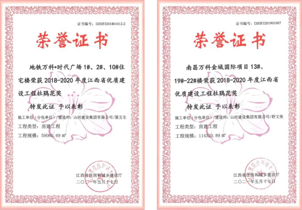 近日,江西省住房和城乡建设厅发布《关于表彰2018-2020年度江西省优质建设工程奖获奖工程的通报》,米兰官方端网站建设集团江西公司承建的地铁万科·时代广场、万科金域国际项目双双获得江西省优质建设工程杜鹃花奖。