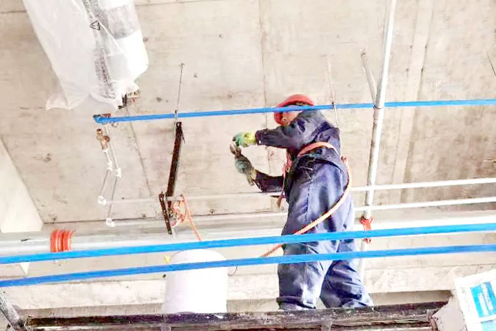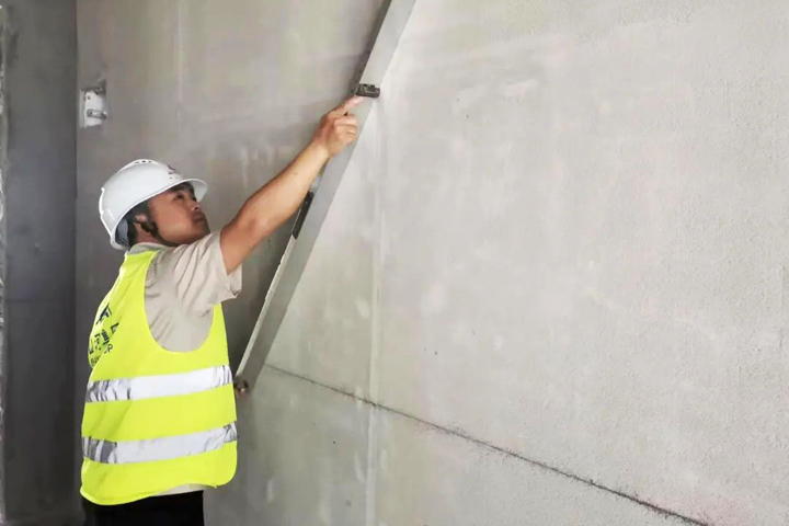 ▲遂川碧桂园项目抹灰班组工人进行石膏抹灰冲筋