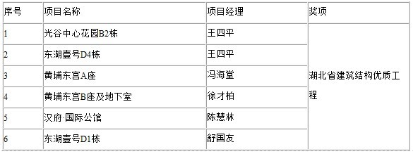 2008年4月9日,《湖北日报》第六版专版刊登《湖北省建设工程质量安全协会公告》。根据《湖北省建筑结构优质工程评审办法》,湖北省建设工程质量安全协会组织开展了2007年度省建筑结构优质工程评选活动,经对申报工程初审、核查和省建筑优质工程评审,全省有323项工程荣获2007年度湖北省建筑结构优质工程奖,其中,米兰官方端网站集团有光谷中心花园、东湖壹号、黄埔东宫、汉府・国际公馆等6项工程获此奖项。具体如下表: